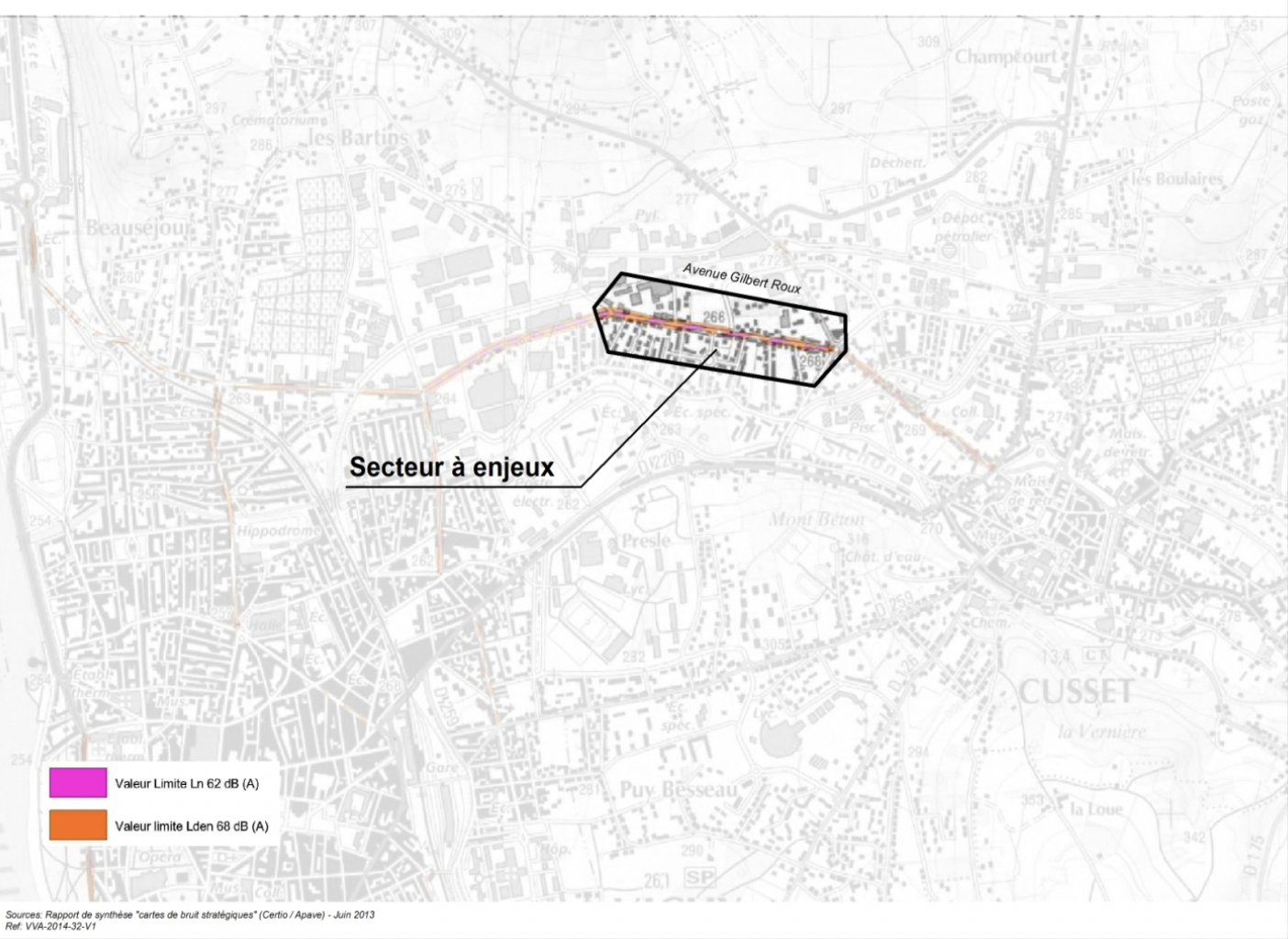 On remarque que les valeurs limites des nuisances sonores liées au trafic routier sont dépassées exclusivement le jour. Elles ne sont quasiment pas dépassées la nuit. Le jour, les mesures n’excédant pas 75 db (A). Donc la marge de réduction des nuisances sonores reste peu importante pour descendre en-dessous de la valeur limite, qui est de 68 db (A) en Lden. A noter que, dans la commune de Cusset, aucun établissement d’enseignement ou de soins/santé n’a été identifié comme exposé dans les cartes de bruit.