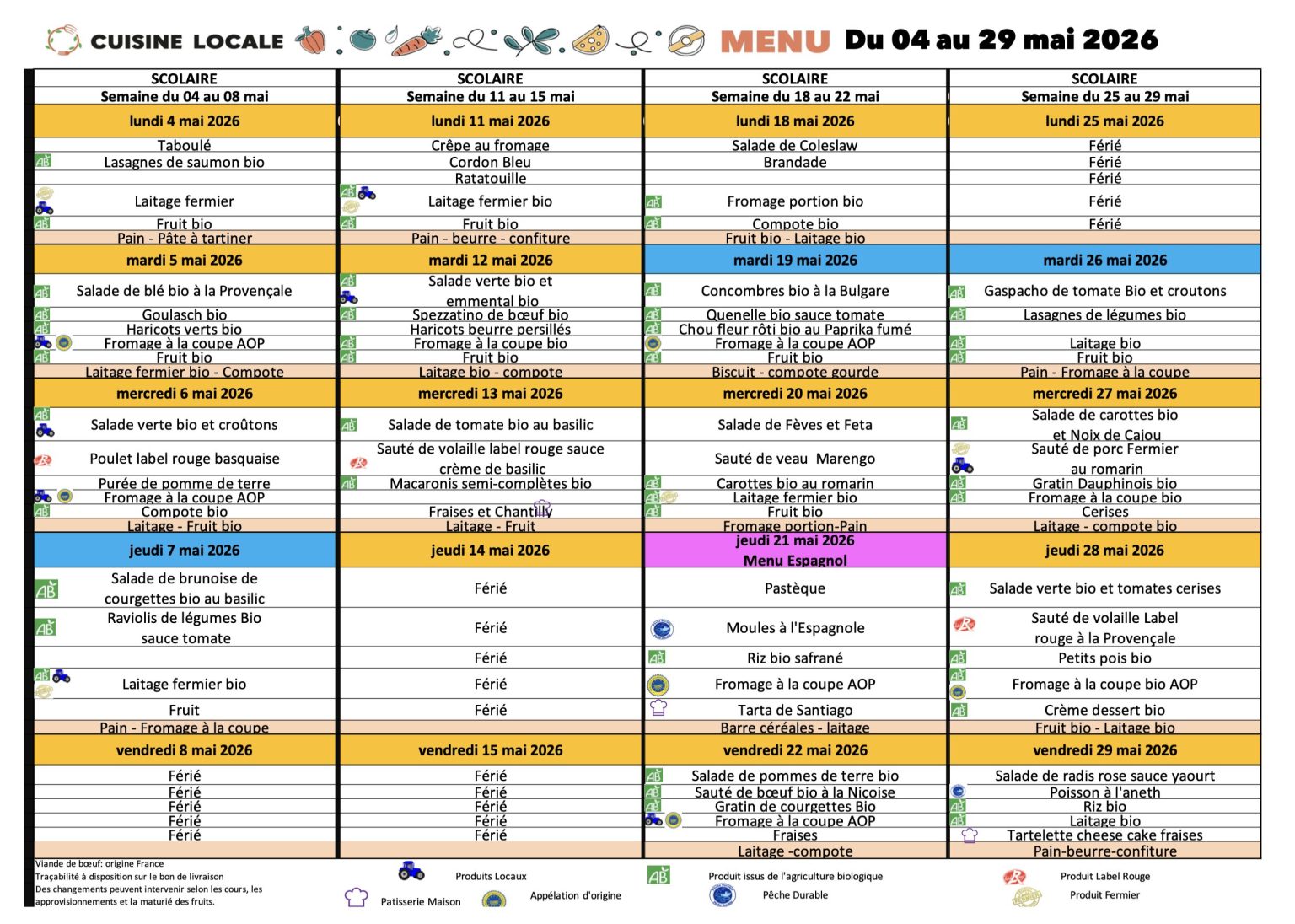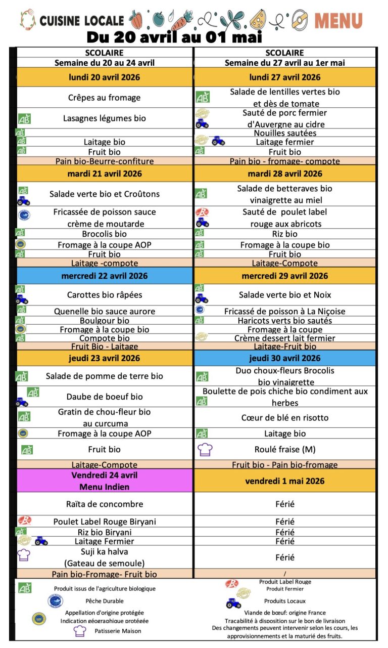 Menu établi pour la période DU 20 avril au 1er mai 2026